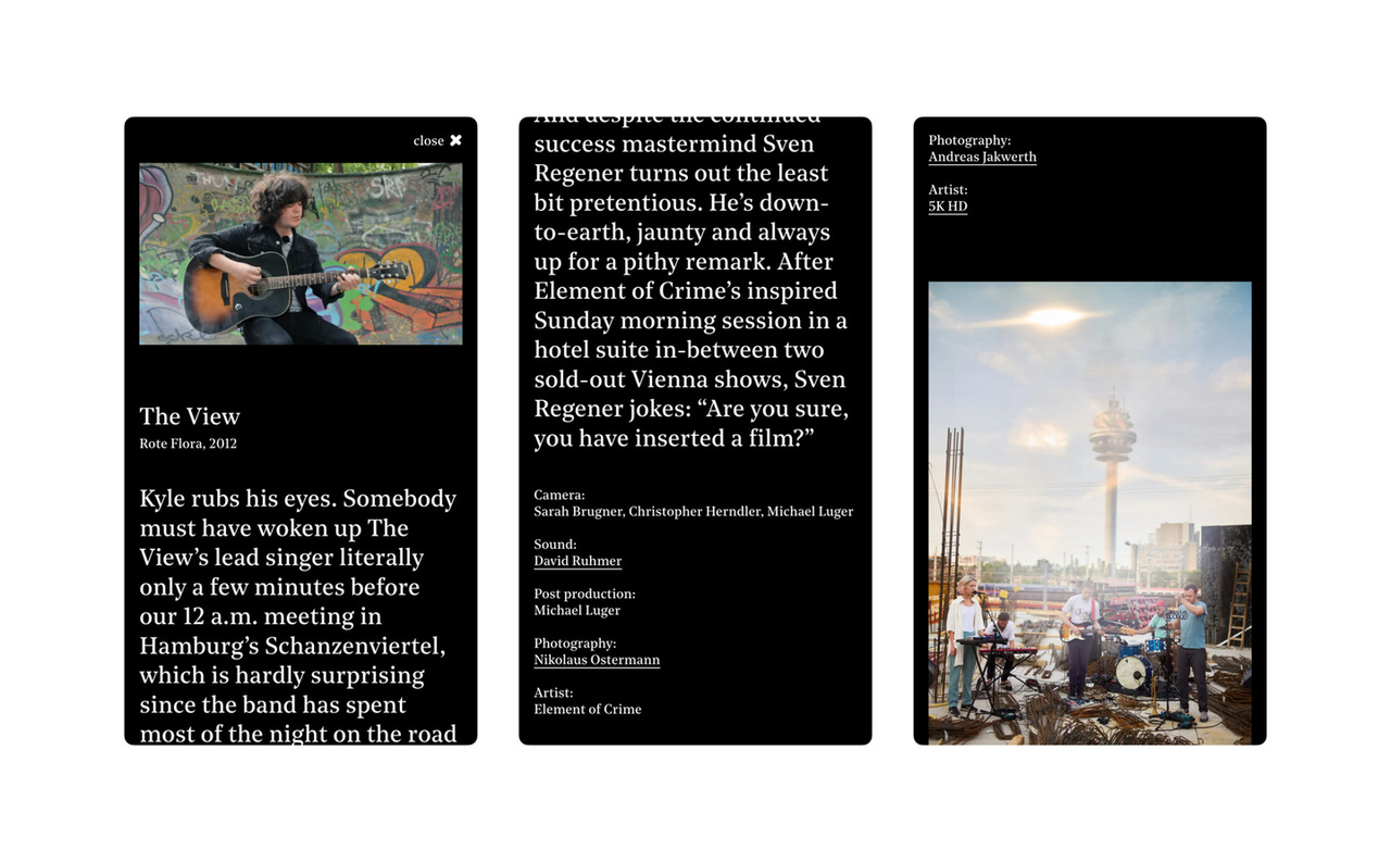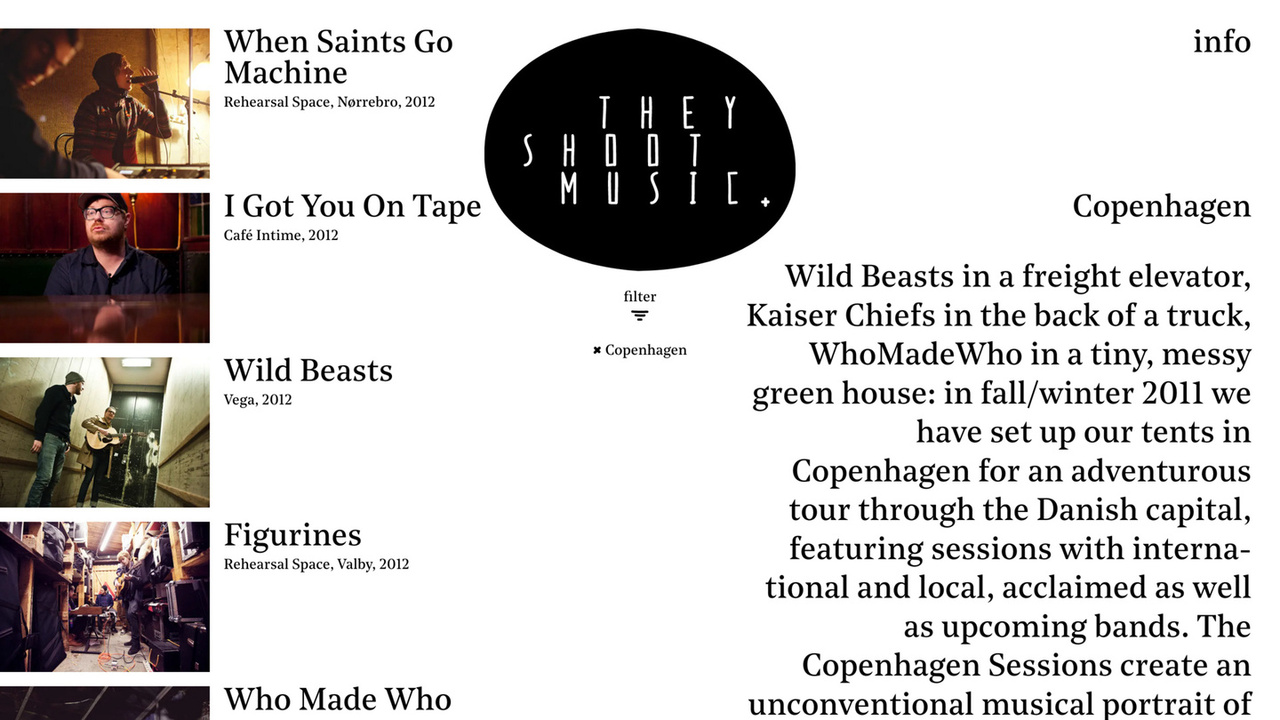 They Shoot Music is a website that features over 600 music videos from musicians around the world. Its documentary style and visual language make the whole project very unique. The exclusive user interface takes you on a journey of discovery.